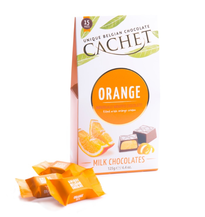 Jednotlivě balené pralinky z mléčné čokolády plněné pomerančovým krémem