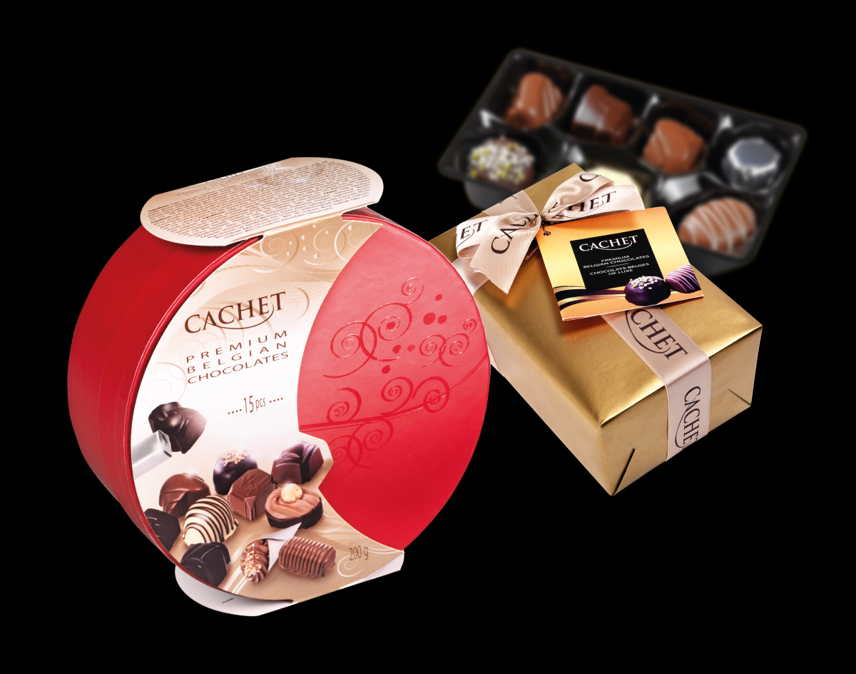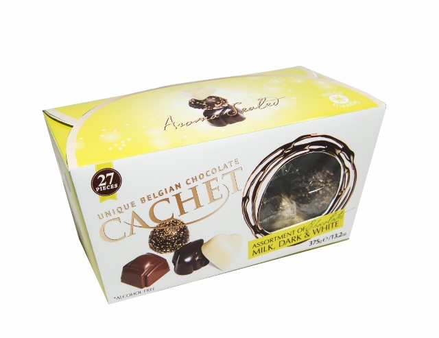 Směs belgických pralinek s variacemi náplní (nugátová, vanilková, kávová, kokosová, karamelová, marcipánová) v mléčné, bílé a hořké čokoládě v dárkovém přebalu s mašlí