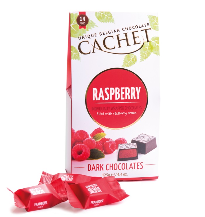 Jednotlivě balené pralinky z hořké čokolády plněné malinovým krémem