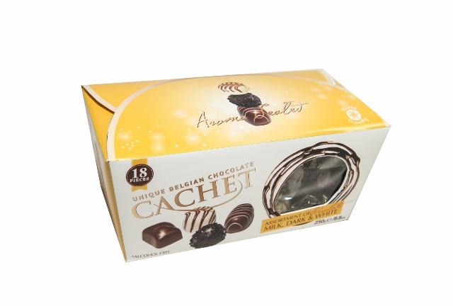 Směs belgických pralinek s variacemi náplní (nugátová, vanilková, kávová, kokosová, karamelová, marcipánová) v mléčné, bílé a hořké čokoládě v neotřelém dárkovém balení